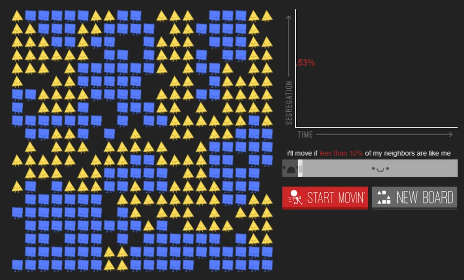 “寓言”玩家通过操控可爱多边形的“邻里”来学习谢林模型,语言清晰明了:“这是一个关于无害选择如何造成有害世界的故事,”《寓言》开篇道。“这些小可爱是50%三角形,50%正方形,100%稍微有点形状歧视。但只是稍微!事实上,每个多边形更喜欢在一个多样化的人群中。”