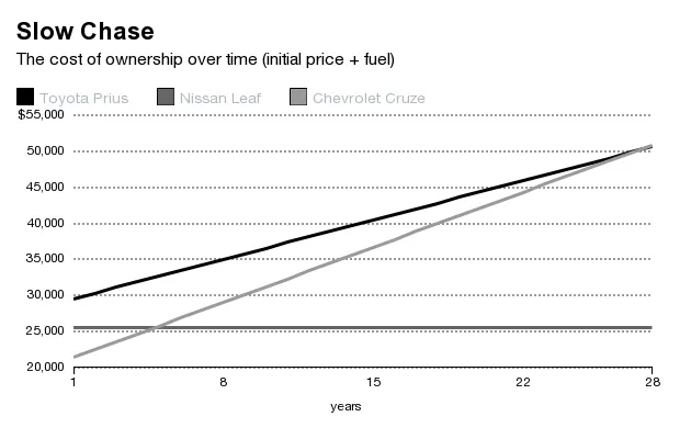 为了了解燃油价格下跌可能对高效车辆市场造成多大影响,我们进行了一些假设性的比较购物。竞争者包括:雪佛兰克鲁兹,一款相当高效的汽油动力紧凑型车;丰田普锐斯,全国最受欢迎的混合动力车;以及日产聆风,全国最受欢迎的全电动车。这些车都有四个门,小行李厢,没什么其他的。我们的分析基于每辆车的成本、其联邦“综合”油耗评级,以及美国平均司机每年行驶的里程(13,476,根据联邦公路管理局的统计)。我们还考虑了普锐斯($2,500)和聆风($7,500)的联邦税收抵免。