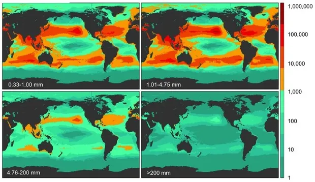 关于这种污染扩散的更多信息:北半球似乎比南半球有更多的塑料垃圾(约占海洋总质量的57%)。而在赤道以南,印度洋似乎充满了碎片,所含颗粒数量超过南太平洋和南大西洋的总和。这里有一张科学家们制作的地图,显示了不同大小塑料颗粒的测量数量(左上角是最小的,右下角是最大的):