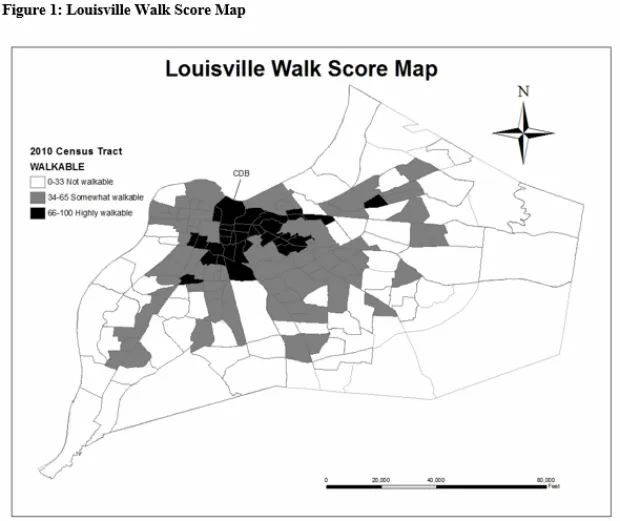 吉尔德布隆等人的路易斯维尔最适宜步行的地方地图。最适宜步行的人口普查区用黑色标出。吉尔德布隆等人城市规划者长期以来认为步行性与犯罪之间存在联系。雅各布斯认为,适宜步行、人口密集的社区受益于“街道上的眼睛”,即在那些人们在一天的各个时段频繁进出的小区中,自然形成的监视。相反,犯罪学家则发现密度、犯罪与社会病态之间存在联系。