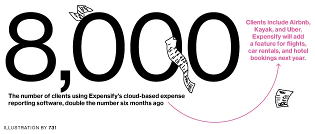 在过去六个月中,Expensify的客户名单翻了一番,达到了8000个个人和公司。创始人David Barrett表示,他的55名员工的公司已经盈利,自2008年成立以来,收入每年翻倍。他迄今为止从包括Uber联合创始人Travis Kalanick在内的投资者那里筹集了约1000万美元的融资。Barrett曾在Kalanick的另一家初创公司——点对点文件共享服务Red Swoosh工作。