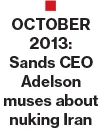 在耶希瓦,他描述了他将如何处理与伊朗关于其持续核计划的谈判。“我们要谈什么?”阿德尔森问。“我想说的是,‘听着。你看到那片沙漠了吗?我想给你看点东西。’”他说他会在沙子里引爆一个美国核弹头,在那里“不会伤害任何灵魂。也许会伤害几条响尾蛇和蝎子或其他什么。”信息是:除非政府放弃任何制造自己核武器的计划,否则下一个蘑菇云将会在德黑兰升起。“你想被抹去吗?那就继续采取强硬立场,”阿德尔森说,引来轻微的掌声。他的言论在几小时内就被发布在YouTube上,并在互联网上引发了反响。根据该国半官方的法尔斯通讯社,伊朗最高领袖阿亚图拉·阿里·哈梅内伊在两周后回应,称美国“应该给这些喋喋不休的人一个耳光,压制他们的嘴。”