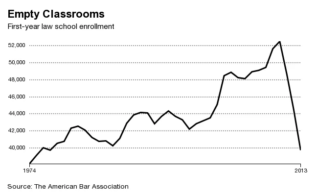 法学院的入学人数正在自由下滑,自2010年以来下降了24%。根据美国律师协会的数据,2013年,法学院的第一年入学人数降至36年来的最低点。上一次法学院教室如此稀疏是在1977年,当时美国只有163所法学院。现在有超过200所。这是令人压力重重的数学,一些专家认为,为了在法律职业兴趣减退的情况下填满他们的班级,法学院正在转向那些在LSAT考试中表现更差的人。