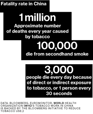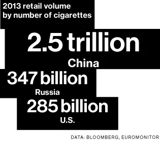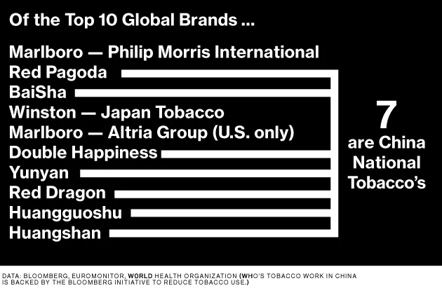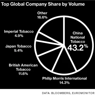 中国国家烟草公司为中国3亿烟民服务,是全球最大的香烟制造商。2013年,它生产了约2.5万亿支香烟。其下一个最大的竞争对手,菲利普·莫里斯国际,生产了8800亿支。