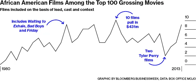 很难夸大电影制作人泰勒·佩里对非裔美国电影近期主流成功的影响。从2005年到2013年,佩里至少有一部电影进入前100名;在这六年中,他至少有两部。也有一些退步的迹象:他最新的梅迪亚电影泰勒·佩里的地狱邻居在四月直接发行DVD,票房收入为900万美元。