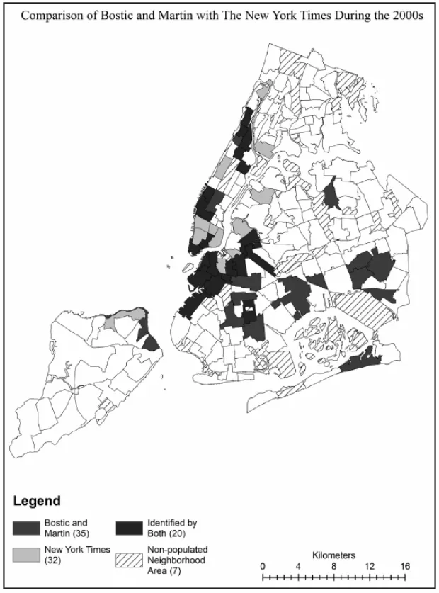 为了探讨这个问题,巴顿的研究使用了LexisNexis数据库搜索,以发现1980年至2009年间,时报所识别的“再开发”纽约市社区。他随后将这些社区与根据两项经典定量研究所使用的指标识别的“再开发”社区进行了比较。第一项研究于2003年发表,由拉斐尔·博斯蒂克和理查德·马丁进行,基于中位数收入识别再开发社区。他们的方法将再开发社区视为那些中位数收入从低于城市中位数的50%增长到超过50%的社区。第二种策略基于2005年的一项研究,由兰斯·弗里曼进行,基于收入、教育和住房的更广泛变化集识别再开发社区。对弗里曼而言,再开发社区是那些起初中位数收入低于整个城市水平,但随后教育水平和房价上升到超过城市水平的社区。巴顿的研究集中在纽约市社区的再开发,基于城市规划部识别的188个社区区域的数据。