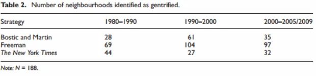 下面的表格来自巴顿的研究,显示了在三个时间段内,每种方法识别的绅士化社区数量。三种方法之间的差异显而易见,显示了识别绅士化的方式如何依赖于所使用的方法。