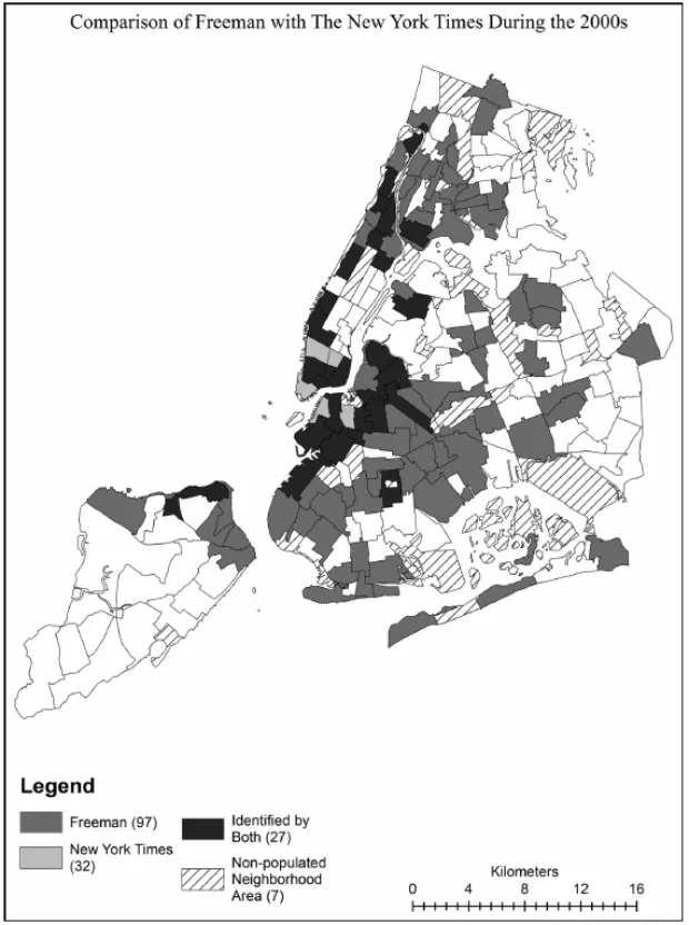 巴顿这里突出的事实是,城市中许多显著的社区变化被*《纽约时报》忽视。灰衣女士在曼哈顿和布鲁克林邻近地区(如威廉斯堡)的“时髦”社区中更可能标记绅士化,而不是在布朗克斯和皇后区,特别是在1990年代和2000年代。一般来说,《纽约时报》讨论的绅士化社区与博斯蒂克和马丁使用的更严格的方法更为一致,而与弗里曼的方法则不然。尽管如此,正如巴顿所写,“这两种基于人口普查的策略与《纽约时报》*的关联充其量是适度的。”