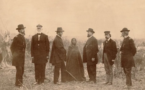 特里将军,哈尼将军,谢尔曼将军,阿拉帕霍妇女,桑博恩将军,塔潘上校,以及奥古尔将军,1868年。亚历山大·加德纳/纳尔逊-阿特金斯艺术博物馆内战后,新铁路开始建设,印第安人开始被迫迁出。随着他所拍摄的战争时期逐渐过渡到重建,亚历山大·加德纳在这里记录密西西比河以西正在发生的变化。