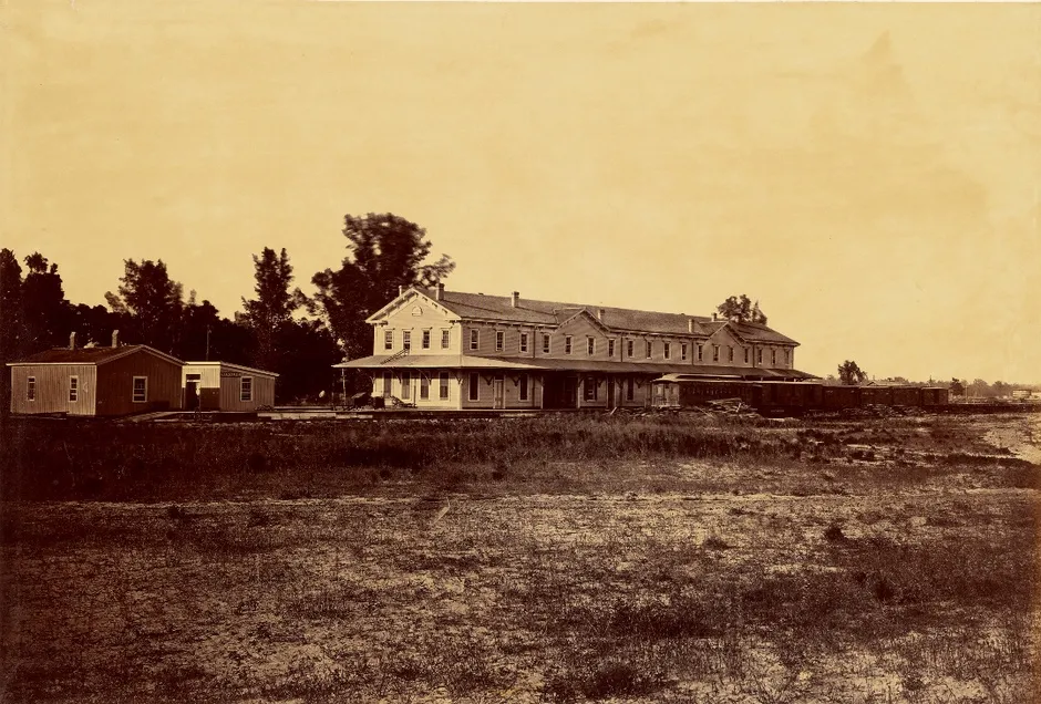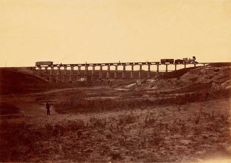 1867年,亚历山大·加德纳拍摄的哈克堡附近的景观。相纸印刷,13 1/16 x 18 1/2 英寸。洛杉矶贾·保罗·盖蒂博物馆19世纪下半叶发生的铁路扩张推动了白人工业家和政府官员的经济和政治目标。然而,加德纳将铁路扩张视为土著部落与取代他们的人的潜在桥梁。他的一张调查照片,阿斯平沃尔指出,显示了一名被杀的士兵孤独地躺在地上。“他在照片中使用尸体来表明铁路是必要的。”随着人们通过新的、更快的方式在全国范围内相互接触,也许土著人和定居者有一天可以共存。