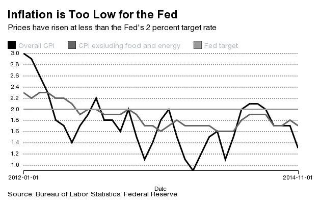 美联储发布了其在2012年1月设定的2%的通胀目标。从那时起,消费者价格的年复合增长率仅为1.4%——这是一个重大失误。劳工统计局在12月17日星期三宣布,CPI的年增长率仅为1.3%。当然,这在很大程度上是由于原油价格大幅下跌导致的汽油价格大幅下降。但即使剔除食品和能源这两个波动性较大的类别,过去12个月的增长率也低于目标,为1.7%。(美联储使用一种不同的通胀衡量标准,称为个人消费支出价格指数。它显示出相同的模式。总体数字在截至10月的过去一年中上涨了1.4%,自2012年1月以来年化上涨了1.3%;核心数字在截至10月的过去一年中上涨了1.6%,自2012年1月以来年化上涨了1.4%。)