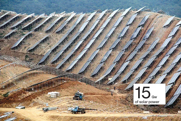 中国工人在安徽省芜湖的光伏发电站安装太阳能电池板摄影:Imaginechina/AP照片