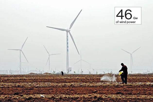 农田位于河北省张家口的风电场旁摄影:Imaginechina/AP照片根据美国能源信息管理局(EIA)的数据,中国在2011年占全球煤炭燃烧量的近一半。该国也是导致全球变暖的温室气体最大排放国——大部分碳排放来自煤炭燃烧。清华大学的一位教授计算出,2012年煤炭造成的雾霾导致中国670,000人死亡。