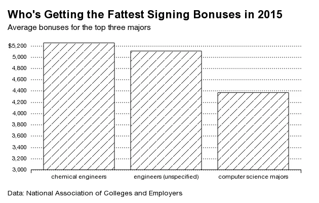 根据全国大学与雇主协会对260家雇主的调查,最有可能获得签约奖金的学生是那些主修商业、工程或计算机科学的学生。化学工程师有望获得最慷慨的奖金($5,250),其次是他们更一般的工程同行($5,107)、计算机科学专业($4,364)、商业专业($3,958)和会计专业($3,682)。