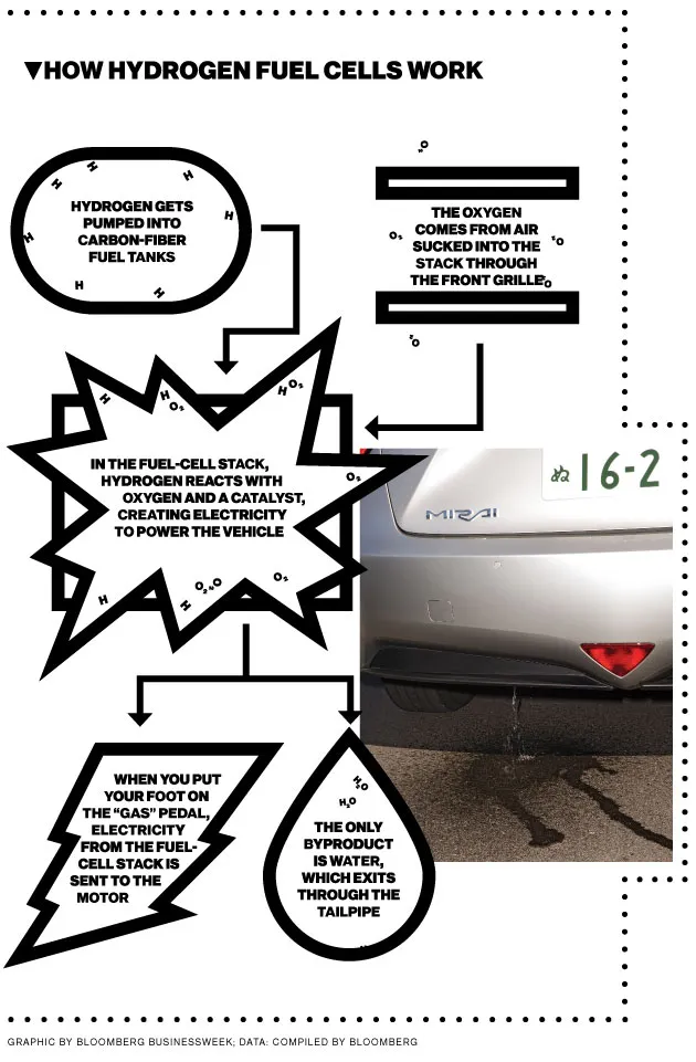 丰田认为汽车的演变远未结束。当氢能与化石燃料竞争时,他设想更动态的雷达系统、高分辨率激光和预测数据系统将减少交通事故死亡人数。最重要的是,他将燃料电池车视为“氢社会”创建的催化剂。 丰田在1992年开始了燃料电池的开发,差不多与普锐斯油电混合动力发动机的研发同时进行。到2008年,管理层清楚地意识到戴姆勒、本田和现代汽车也在迅速推进氢能汽车项目。丰田董事长内山田竹志是普锐斯的推动力,他决定在那一年将汽车从开发阶段转入大规模生产。然而,当时制造一辆燃料电池车的成本“接近每辆100万美元,”丰田负责产品开发和底盘工程的常务官小木佐智说。