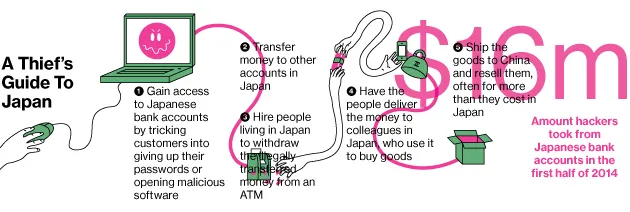 警方表示,这些诈骗涉及多个步骤:中国黑帮通过欺骗客户打开恶意软件或泄露密码来入侵日本银行账户。他们通过将钱转移到日本的其他账户来盗取资金,然后雇佣居住在该国的人在ATM机上提取现金。这些人将钱交给在日本的同伙,后者用这些钱购买运往中国的商品。在那里,这些产品被出售,所得款项归团伙首脑所有。