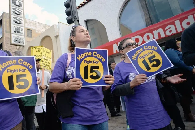 家庭医疗保健工作者与快餐工作者及其支持者在2014年12月4日洛杉矶举行的集会和游行中,要求将最低工资提高到每小时15美元。摄影师:Robyn Beck/法新社通过Getty Images自1938年国会首次要求公司支付员工最低工资和加班费以来,许多家庭护理工作者一直被 排除在外。一年前,奥巴马政府 发布新规,以改变这种情况,将这些基本标准扩展到大多数在家中照顾老年人或残疾客户的雇员。