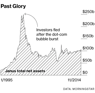 在Weil所称的“愉快的巧合”中,Gross正好在Janus宣布收购VelocityShares时加入,该公司运营交易所交易基金。根据投资公司协会的数据,自2008年以来,行业范围内的ETF资产已增长超过三倍,达到1.9万亿美元。“比尔为我们在封闭式基金和ETF等产品包装中变得非常相关打开了大门,”Janus的产品开发负责人Kelly Hagg在一封电子邮件中写道。在1990年代,计算机、生物技术和互联网股票的华丽回报,以及像汤姆·马尔西科和海伦·杨·海斯这样的明星经理,使Janus成为最热门的基金公司之一。资产在2000年8月达到了3340亿美元的峰值。那时,科技股已经开始崩溃,导致以科技为主的纳斯达克综合指数在2000年3月10日至2002年10月9日之间损失了78%的价值。经济下滑重创了Janus的回报和声誉。