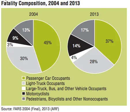 2013年的行人死亡人数比2009年高出15%,当时的死亡人数创下历史最低。至于“NHTSA”所使用的尴尬术语“踏板骑行者”,指的是骑着有轮子的东西的人,死亡人数实际上上升了1.2%,达743人。