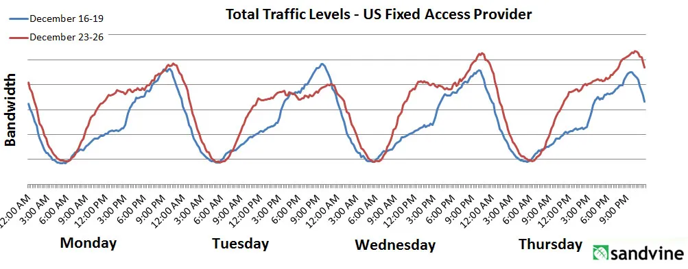 根据Sandvine的发言人Dan Deeth的说法,在重大节日的晚餐期间离开互联网几个小时——然后又以强烈的态度回归——似乎是一种普遍特征。“这些是全球趋势,”他说。“你在美国圣诞节看到的趋势,在穆斯林国家的斋月期间也会看到类似的情况。”