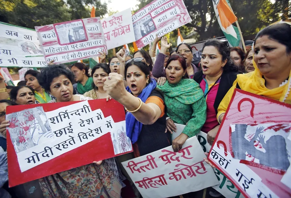 全印度女性国大党成员在2014年12月8日于新德里举行的抗议活动中高喊口号并举着标语,抗议一名女性乘客被强奸。标语上写着:“这个国家充满羞耻,而莫迪却出国”(左下)和“对女性的暴行不断上升,莫迪政府在哪里?”(顶部)。路透社/阿尼迪托·穆克吉
