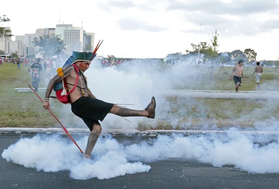 一名巴西土著在2014年5月27日巴西利亚的曼内·加林查足球场外,向阻止一群印第安人接近的防暴警察踢回一枚催泪瓦斯弹。警方发射催泪瓦斯弹以控制试图前往巴西利亚体育场的反世界杯抗议者,世界杯奖杯在此公开展出。路透社/乔德森·阿尔维斯