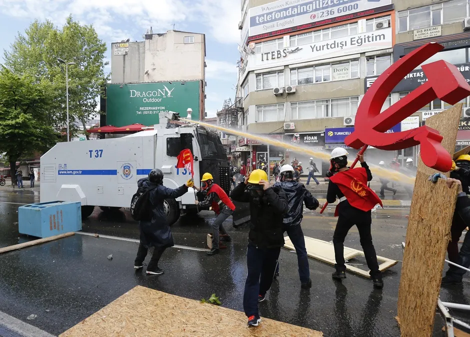 在2014年5月1日的五一示威中,伊斯坦布尔的防暴警察使用水炮驱散抗议者。土耳其警方发射催泪瓦斯,阻止数百名抗议者违反五一集会禁令,抵达伊斯坦布尔市中心的塔克西姆广场,这是去年夏天数周抗议的焦点。路透社/穆拉德·塞泽尔