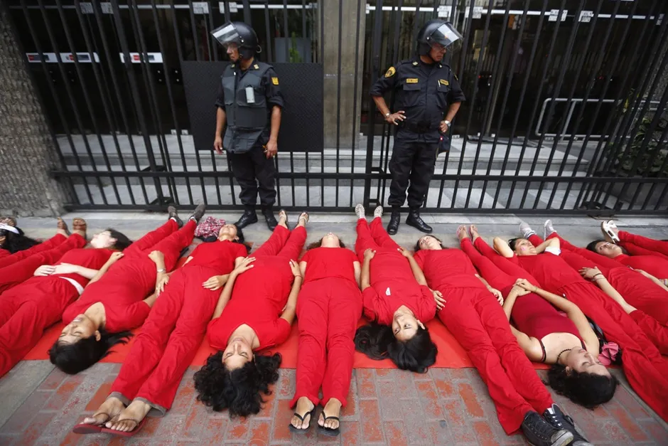 活动人士身穿红色在2014年3月7日国际妇女节期间在利马的妇女部前抗议,形成一条象征女性权利被政府践踏的人“红地毯”。路透社/ Mariana Bazo