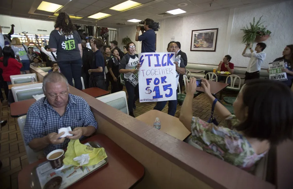 一名持标语的活动人士在2014年9月4日加利福尼亚州洛杉矶的麦当劳餐厅旁经过,抗议要求提高快餐工人的工资。美国150个城市的快餐工人发起了为每小时15美元工资的抗议活动,其中包括在纽约时代广场的静坐,警方称有19名示威者被捕。路透社/马里奥·安祖尼