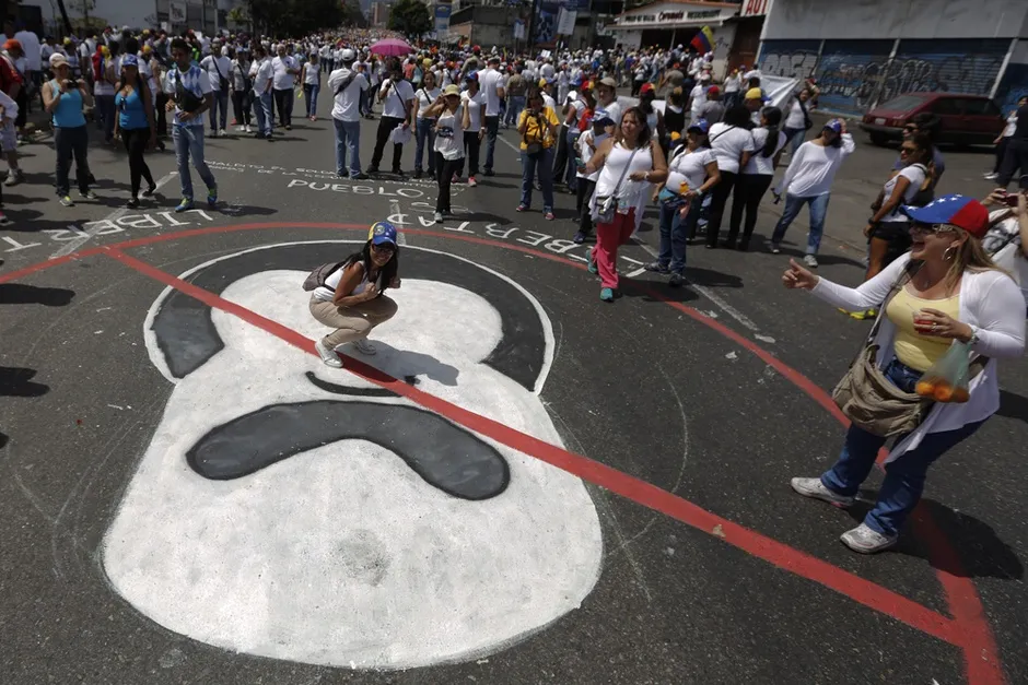 一名反对派支持者在2014年2月22日的加拉加斯抗议活动中蹲在一幅描绘委内瑞拉总统尼古拉斯·马杜罗的画作上。被监禁的抗议领袖呼吁支持者继续和平示威,尽管暴力事件导致至少六人死亡,并动摇了这个石油输出国组织成员国。路透社/Tomas Bravo