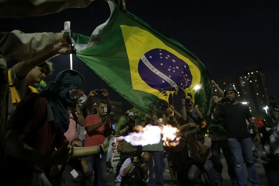 抗议者在2014年5月15日里约热内卢的2014年世界杯抗议活动中焚烧巴西国旗。反对世界杯和用于建造体育场的公共资金的巴西人呼吁全国范围内的抗议活动。路透社/里卡多·莫拉斯