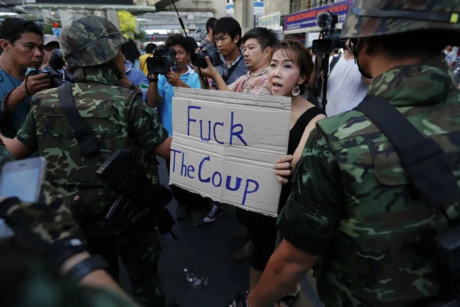 2014年5月23日,一名女性在中央曼谷的抗议活动中举着标语,军队抵达以控制反对军事统治的抗议。泰国陆军总司令巴育·陈欧查在发动政变后的一天,提出了国家的计划,表示在选举之前需要进行改革,但一些泰国人违反了戒严法以表达对他接管的反对。尽管五人以上的抗议被禁止,数百人,包括学生,仍在一个中央购物区聚集,表达对军事统治的反对。路透社/达米尔·萨戈尔