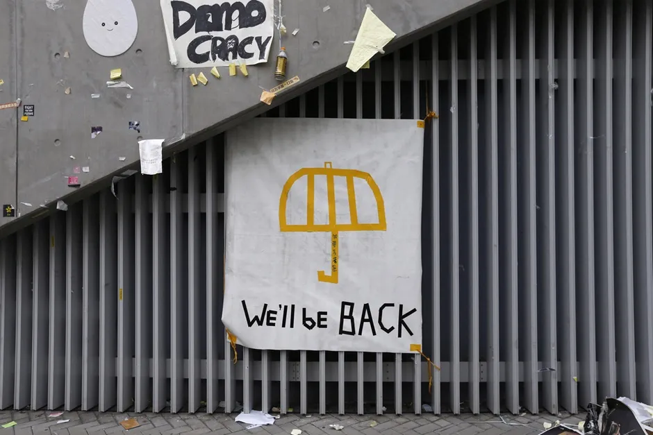 2014年12月11日,在香港金钟的主要“占领”抗议现场,一面墙上贴着写有“我们会回来”的伞的海报。香港警方在12月清除了大部分主要抗议现场,标志着在中国控制的城市中持续了两个月的街头示威活动的结束,但许多人高喊:“我们会回来。”路透社/鲍比·叶