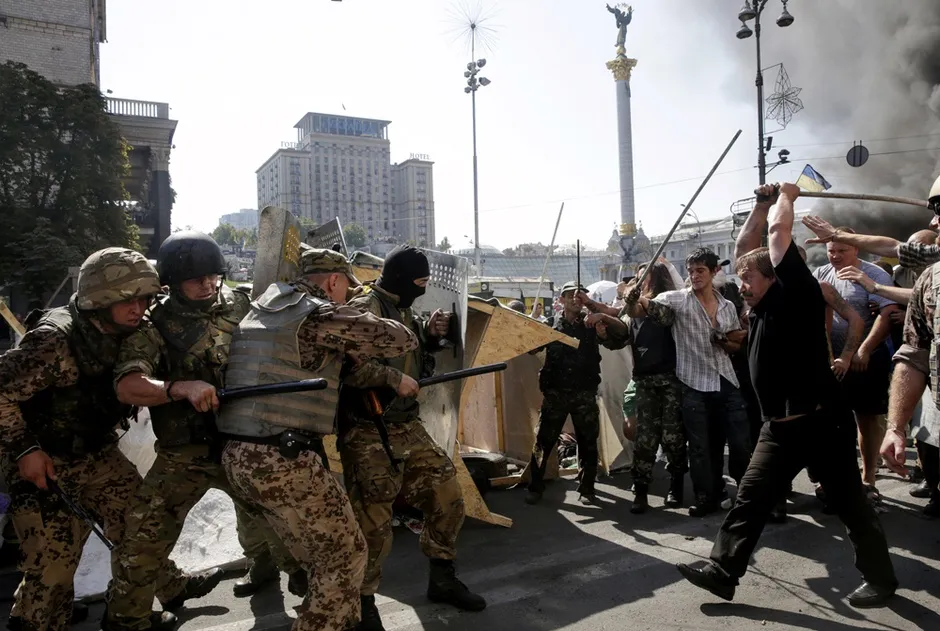 亲政府部队于2014年8月7日在基辅独立广场与抗议者发生冲突。路透社/康斯坦丁·切尔尼奇金