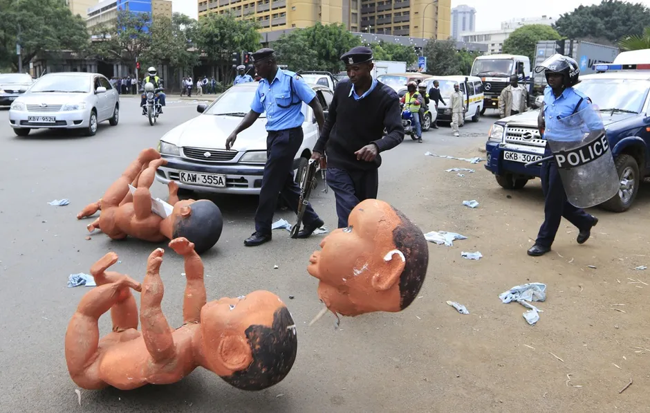 肯尼亚警方在2014年2月13日的“肯尼亚是我们的家”游行中踢走抗议者遗留在肯尼亚首都内罗毕主要道路上的巨型婴儿模型。肯尼亚警方身穿防暴装备,向超过200名前往国会示威反对腐败、不安全、失业和贫困的抗议者发射催泪瓦斯。“肯尼亚是我们的家”在斯瓦希里语中意为“肯尼亚是家”。路透社/Noor Khamis