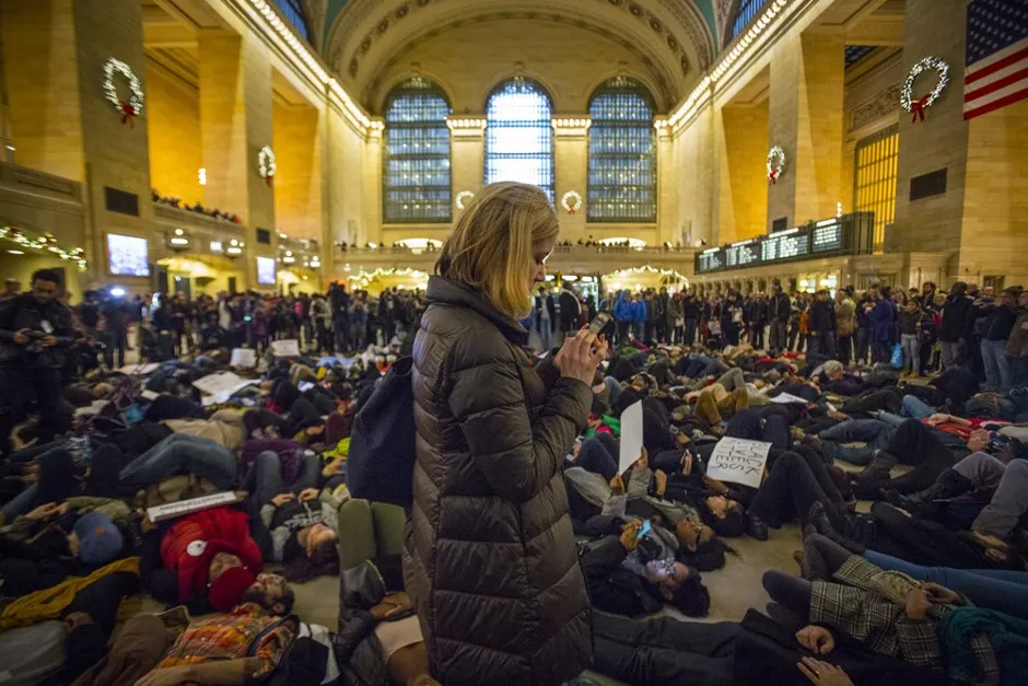 一名女性在2014年12月6日于纽约中央车站拍摄抗议者进行“死亡演练”的照片,抗议窒息致死的受害者埃里克·加纳。路透社/安德鲁·凯利