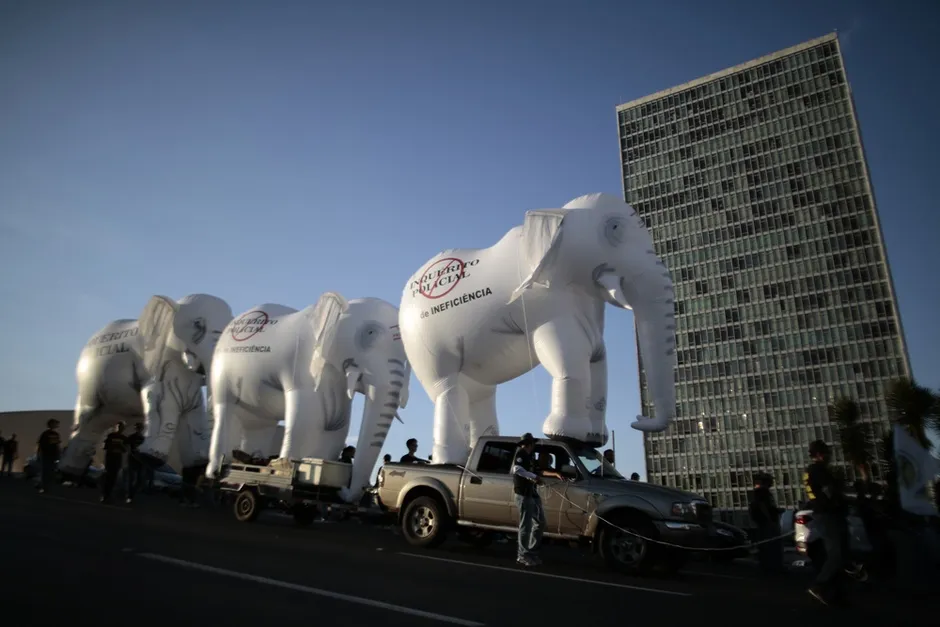 2014年3月12日,联邦警察在巴西利亚的抗议活动中走过巨型充气“白象”,抗议者要求提高工资和改善工作条件。根据抗议组织者的说法,这些充气“白象”象征着联邦警察的结构性低效。路透社/ Ueslei Marcelino