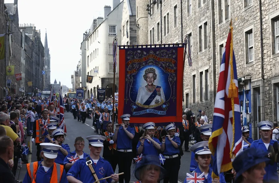 2014年9月13日,来自北爱尔兰和苏格兰的约12,000名新教忠诚者在苏格兰爱丁堡游行,情感激动地支持保持苏格兰在联合王国内。苏格兰后来投票决定维持与联合王国其他地区307年的联盟。路透社/拉塞尔·切恩