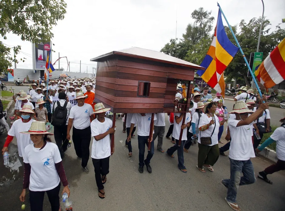 2014年10月6日,人们在金边市中心举行的世界人居日游行中举着房屋模型。根据当地媒体报道,博恩卡克湖、博雷基拉社区及其他受私人公司开发商影响的社区的前居民聚集,呼吁柬埔寨政府停止驱逐他们的家园。路透社/萨姆朗·普林
