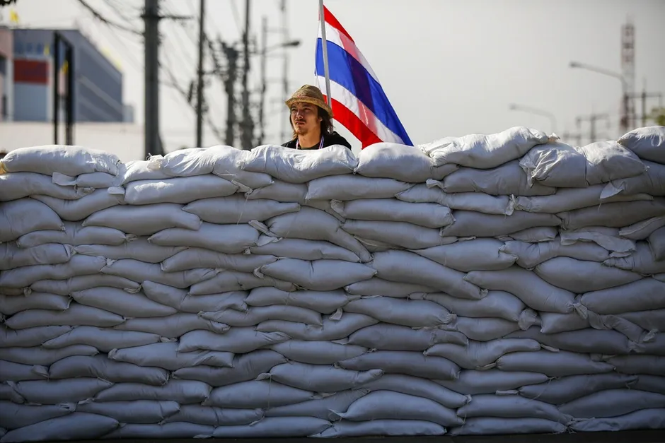 2014年1月13日,一名反政府抗议者在曼谷市中心的主要交叉口封锁期间站在路障后面。数千名反政府抗议者周一在曼谷的主要交叉口开始封锁,试图瘫痪泰国首都,向总理英拉·西那瓦施加更大压力,要求其辞职。路透社/阿提特·佩拉旺梅塔