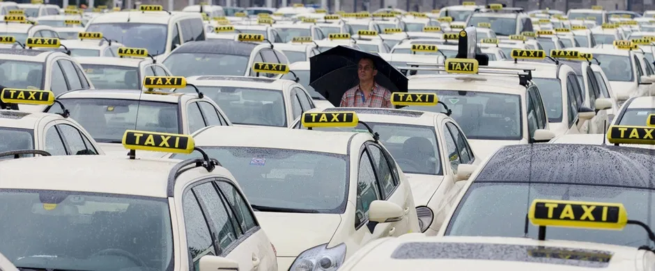 一名男子于2014年6月11日在柏林奥林匹克体育场前参加针对打车应用程序的全欧洲抗议活动, licensed出租车司机担心这些应用程序会将未受监管的私人司机涌入市场。路透社/托马斯·彼得