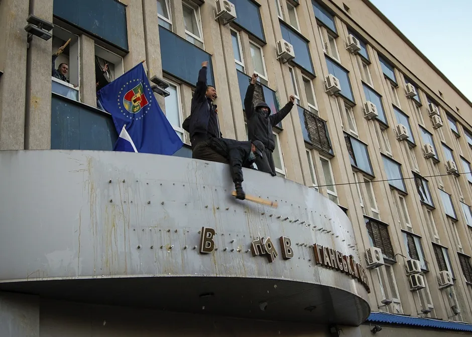 亲俄抗议者于2014年4月6日在乌克兰东部卢甘斯克州的国家安全局大楼上拆除标志。数十名抗议者冲进卢甘斯克附近的国家安全局办公室,造成两名抗议者和一名警察受伤,乌克兰一家电视台报道。路透社/记者