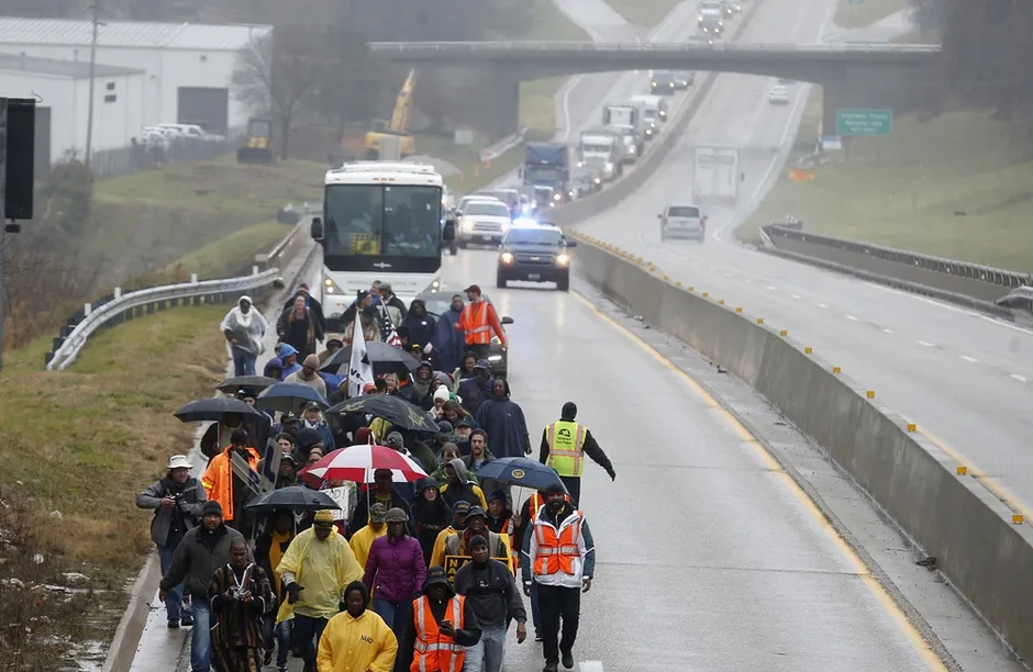 抗议警方对黑人美国人待遇的活动人士于2014年12月5日在密苏里州杰斐逊市向州议会大厦游行。路透社/吉姆·杨
