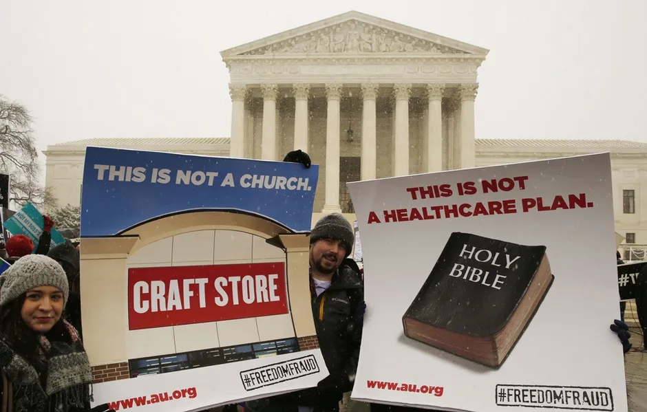2014年3月25日,华盛顿特区的抗议者在最高法院的台阶上举着标语,挑战《平价医疗法案》中要求雇主为员工提供避孕保险的条款。路透社/ Larry Downing
