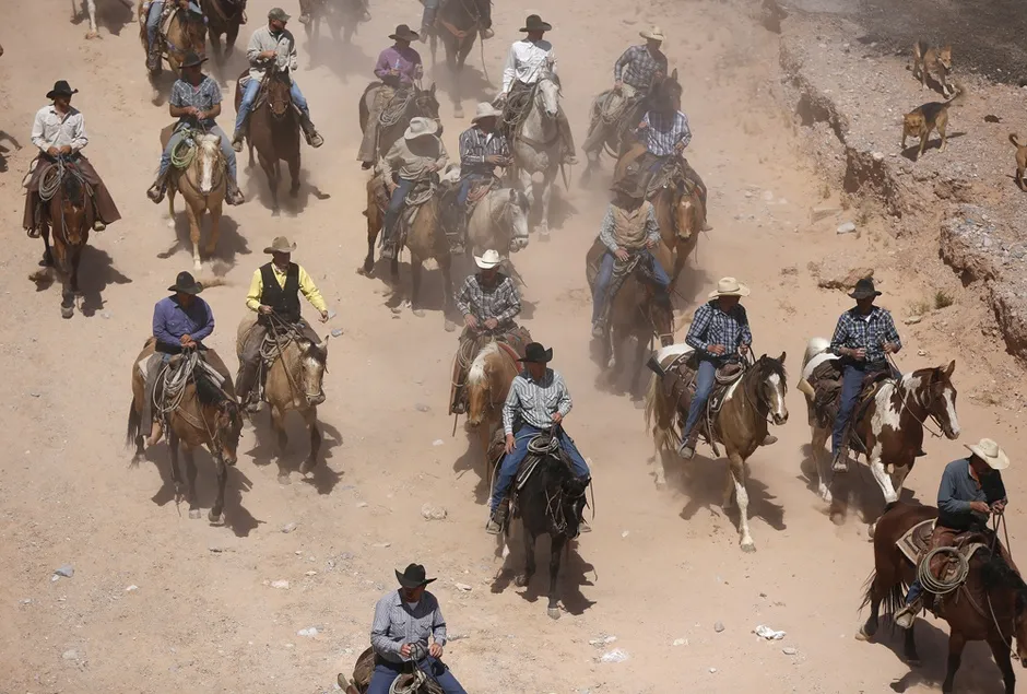 抗议者于2014年4月12日从内华达州班克维尔附近的土地管理局基地营的门口撤退,那里扣押了属于牧场主克莱文·邦迪的牛。美国官员结束了与数百名武装抗议者在内华达沙漠的对峙,取消了政府对非法在联邦土地上放牧的牛的围捕,并将约300头牛归还给邦迪牧场主。路透社/吉姆·乌尔克哈特