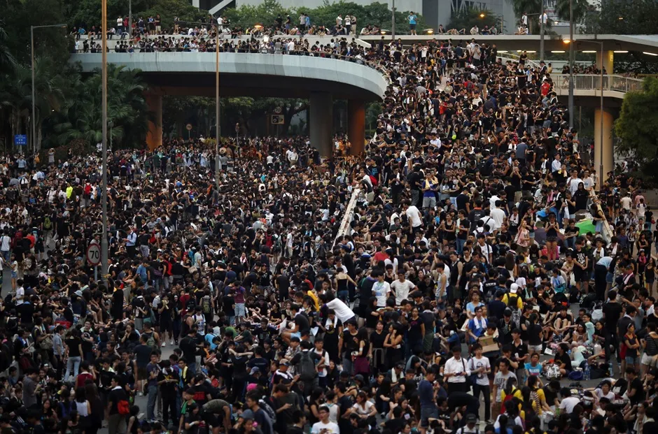2014年9月29日,抗议者在香港政府总部外封锁通往金融中心的主要街道。香港民主抗议者在全球金融中心的中心坚定不移,面对催泪弹和警察的警棍冲击,这是自25年前天安门镇压以来,北京面临的最大政治挑战之一。路透社/卡洛斯·巴里