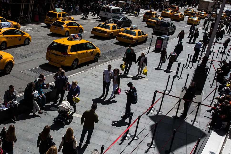 出租车和行人填满了纽约市时代广场的街道和人行道。