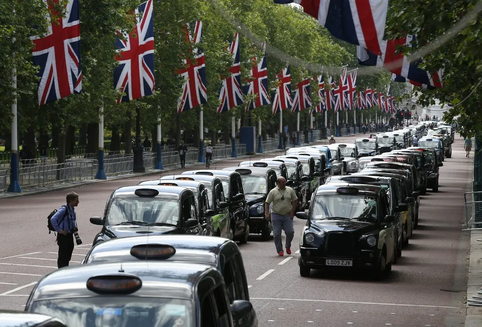 传统的伦敦黑色出租车排成一列,封堵街道以抗议他们认为危害乘客的新技术。美联社照片/桑·谭**"烤鸭官僚主义"**埃芙琳·赵,开放城市,2014年3月11日