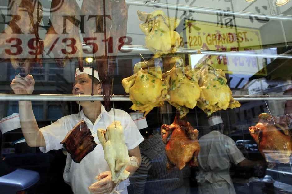大约十年前,纽约市卫生与心理卫生局(DOH)开始对一个奇怪而令人不安的景象感到困惑:整只烤鸭,悬挂在曼哈顿华埠的窗户上。