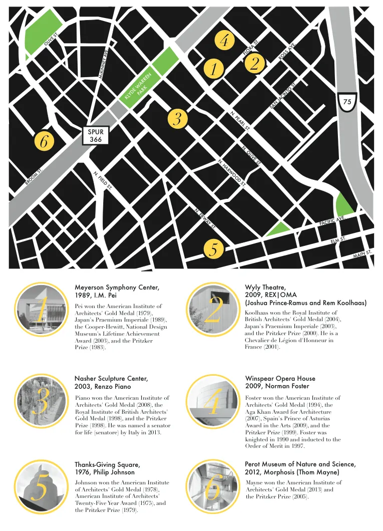 六位不同的普利兹克奖获奖建筑师在艺术区设计了标志性建筑,所有建筑都位于小于一平方英里的区域内。所有设计师都获得过其他著名奖项,包括日本的普雷米乌姆·英佩里尔奖、美国建筑师协会金奖和英国皇家建筑师协会金奖。达拉斯的六位杰出建筑师中,有一位被法国封为骑士,一位被英国封为骑士,还有一位被意大利任命为终身参议员。